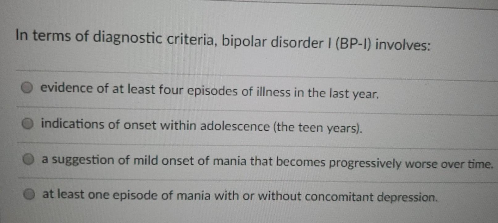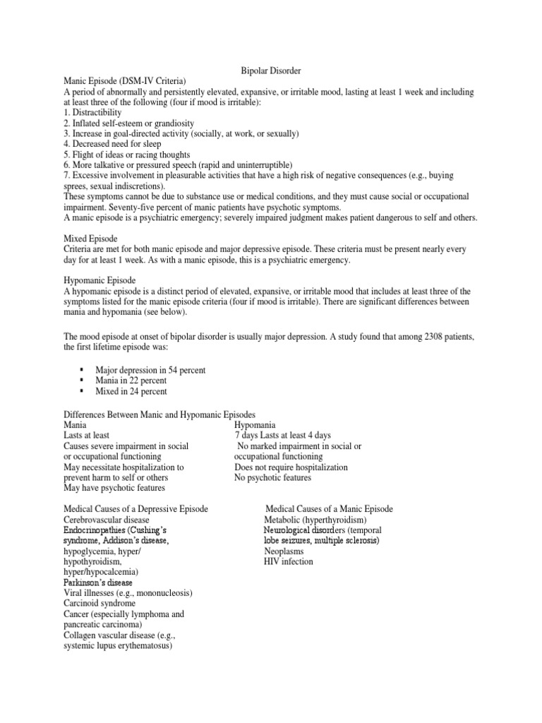 Bipolar disorder, or manic depression, causes symptoms of mania and depression. Bipolar i, bipolar ii, cyclothymia, and bipolar disorder not otherwise specified (table 1).3 criteria for mood episodes involved in diagnosing bipolar disorders. The mood swings can range from if you have bipolar disorder, you may have episodes of depression more regularly than episodes of mania. A person must meet certain criteria before their doctor issues a diagnosis. Related online courses on physioplus.